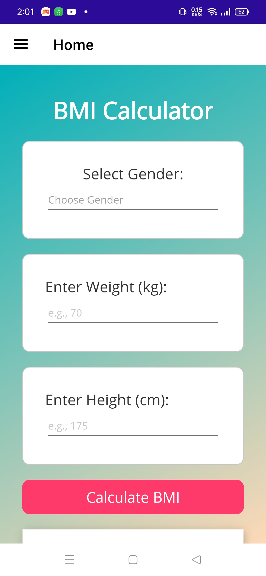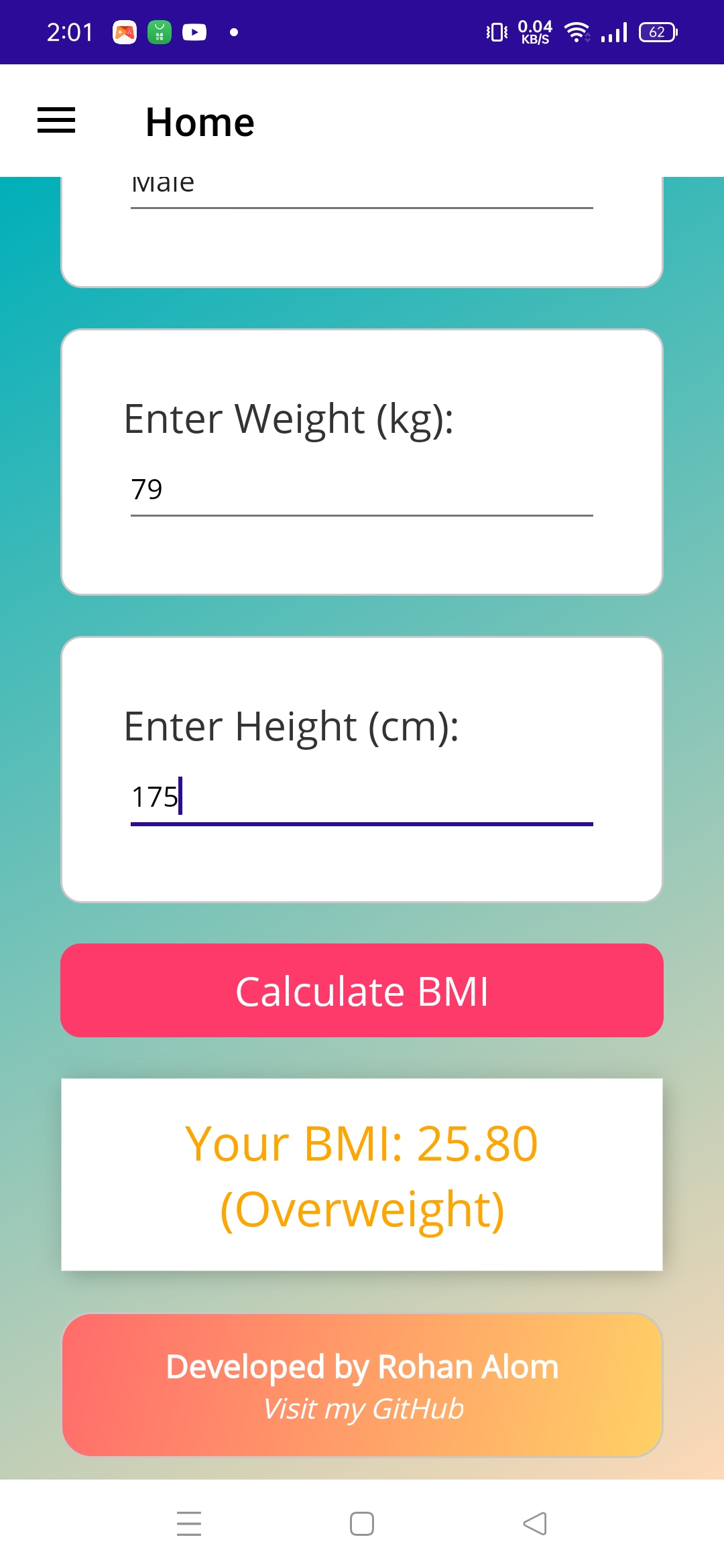 A sleek .NET MAUI app with a gradient UI, animations, and gender-specific BMI classification."