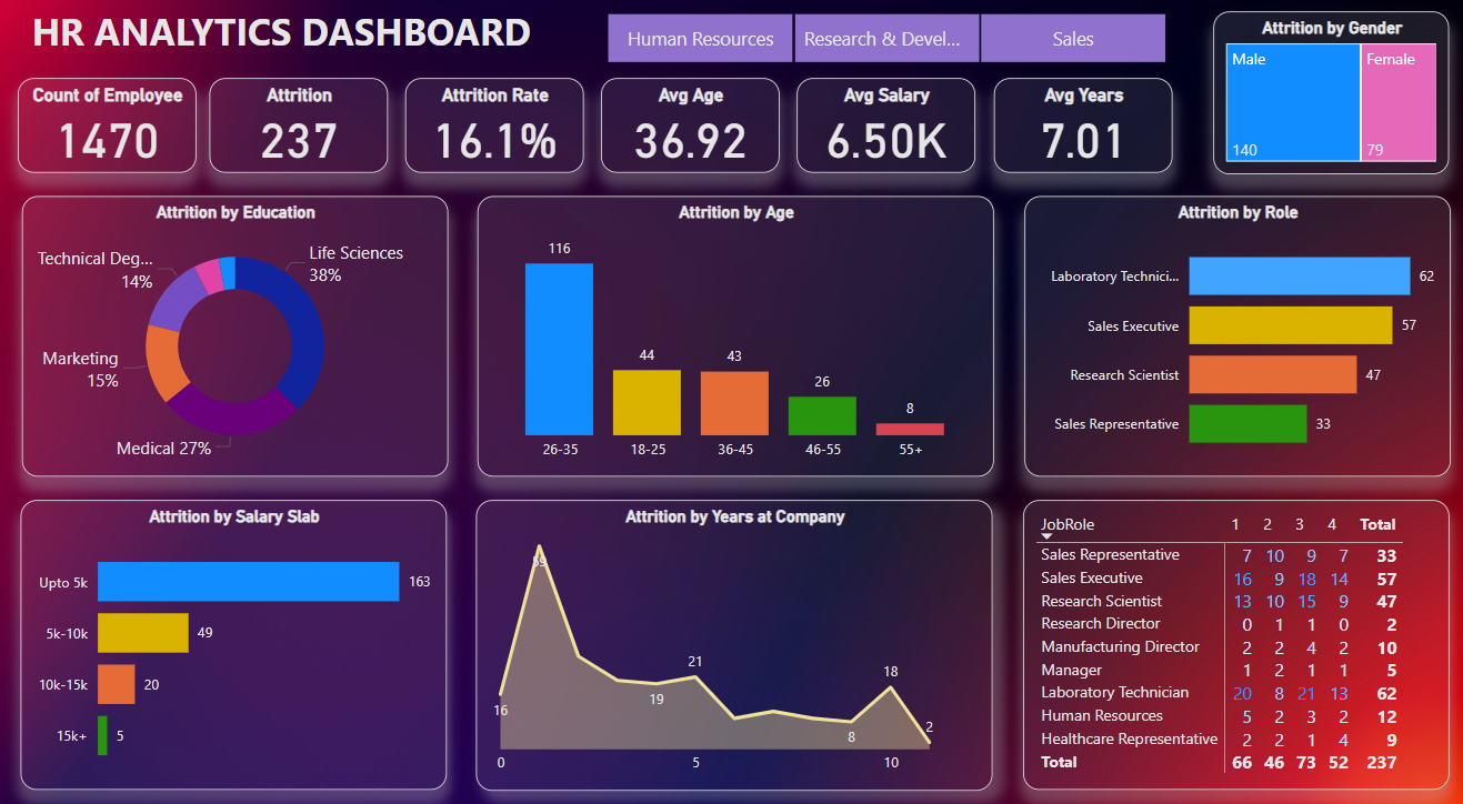 This project delves into the analysis of employee attrition, examining various factors such as education, age, role, salary, years at the company, and job satisfaction ratings.
